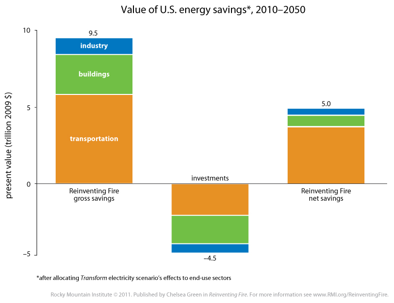 In 2010, the United States (excluding non-combustion uses as raw materials) used 93 quadrillion BTU of primary energy, four-fifths of it fossil fuels. Official projections show this growing to 117 quads in 2050. But delivering those same services with less energy, more productively used, could shrink 2050 usage to 71 quads, eliminate the need for oil, coal, nuclear energy, and one-third of the natural gas, and save $5 trillion in net-present-valued cost. As a better-than-free byproduct of efficient use and a continued shift to renewable supplies, fossil carbon emissions would also shrink by 82–86% below their 2000 levels despite the assumed 2.58-fold bigger economy than in 2010.